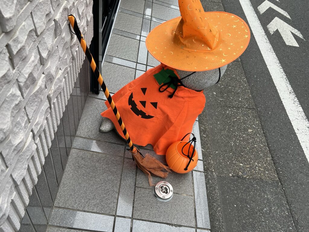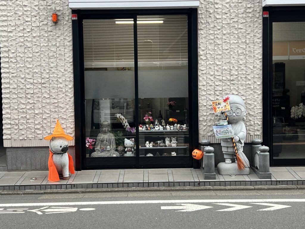 うちの店の小僧さんと犬の石像にもハロウィンの飾りをしました。