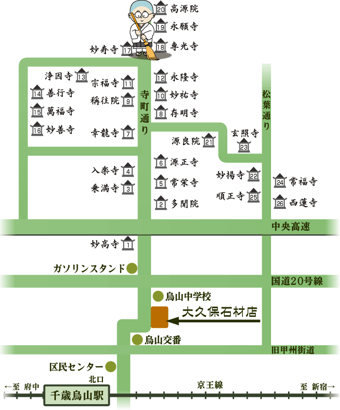 震災後、烏山に移転。世界中で高く評価されている版画家、川瀬巴水の墓がある。
